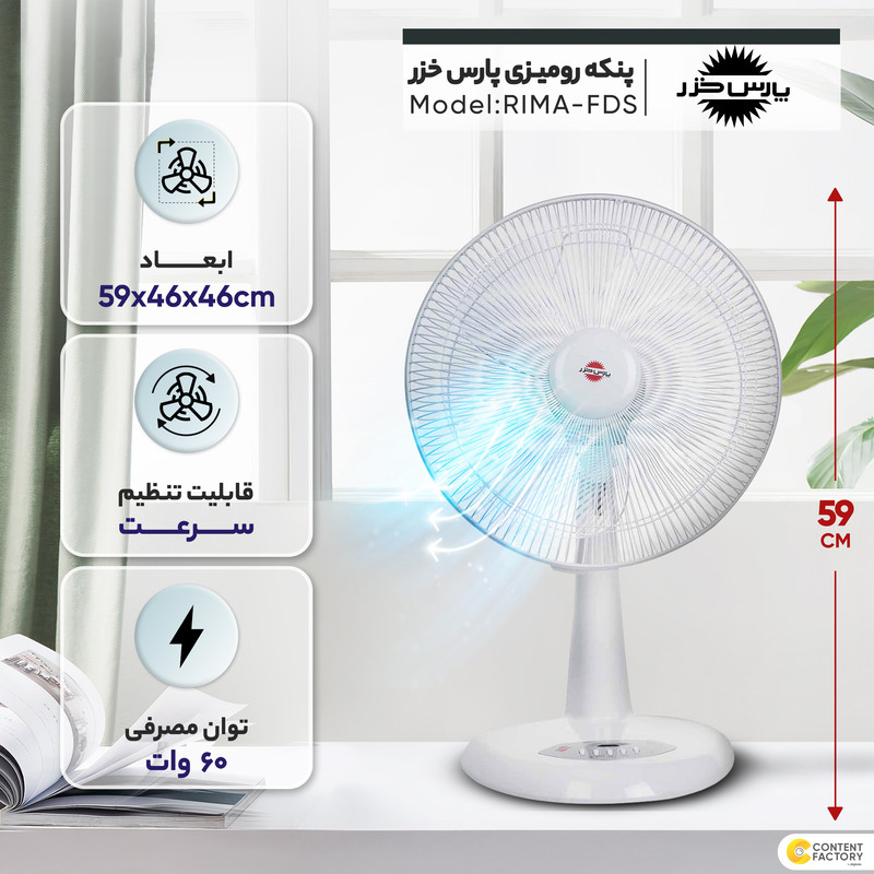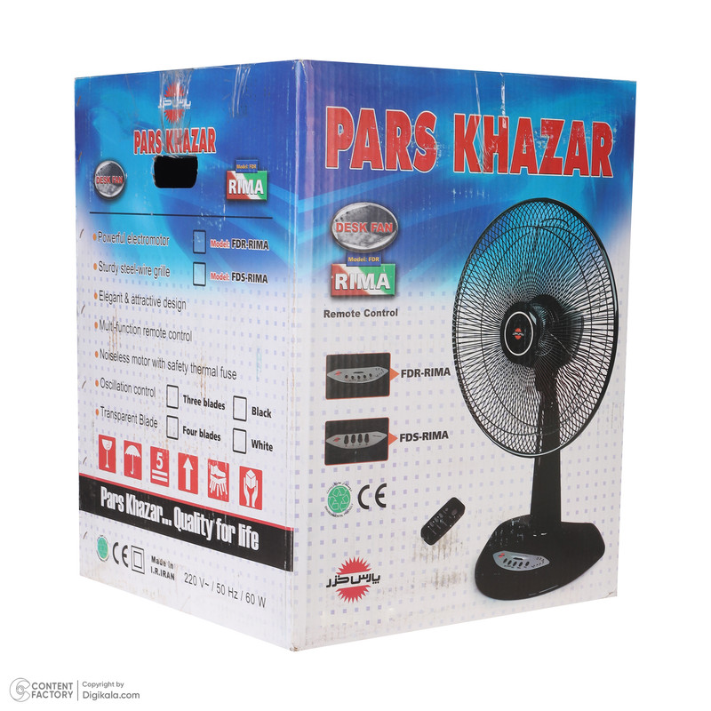 پنکه «پارسخزر» مدل «RIMA-FDS» از پنکههای طرح رومیزی است که توسط اینشرکت تولید و بهبازار عرضه شده است. پنکهها همچنان از دستگاههای سرمایشی محبوب هستند که در خانه و ادارات کاربرد فراوانی دارند. از مزایای پنکهها نسبتبه دیگر دستگاههای سرمایشی میتوان به امکان جابجایی آسان، قابلیت تنظیم زاویه وزش باد، و همچنین وزش باد با گردش افقی اشاره کرد. این مدل دارای چهار پره است که بین دو صفحه محافظ مشبک قرار گرفته است. کاربر ازطریق کلیدهای تعبیهشده روی پایه، قادر به خاموش و روشن کردن و تغییر تنظیمات دستگاه است. کلیدهای تنظیم سرعت در سه حالت است و نشانگر LED نیز دارد. قابلیت تنظیم گردش افقی نیز از دیگر مشخصاتی است که میتواند به کارایی این دستگاه برای خنککردن محیط موردنظر اضافه کند. این دستگاه بهراحتی بهمحل موردنظر جابهجا میشود. طراحی کلاسیک پنکه رومیزی پارسخزر RIMA-FDS به رنگ سفید، و پایه زیبای این مدل آنرا به انتخابی قابلتأمل برای مصرفکنندگان مختلف تبدیل میسازد. از دیگر قابلیتهای این دستگاه میتوان به موتور مجهز به فیوز حرارتی آن اشاره کرد که نگرانیهای حاصلاز فعالیت طولانیمدت این دستگاه را مرتفع میسازد. لازمبهذکر است پنکه رومیزی پارسخزر RIMA-FDS از گواهینامه استاندارد ایمنی محصول و همچنین نشان استاندارد اروپایی CE نیز بهره میبرد. توان مصرفی این پنکه 60 وات است.