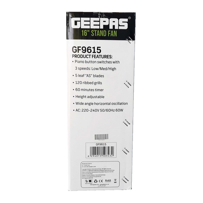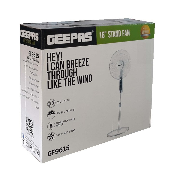 برند جیپاس GEEPAS یکی از عرضه کنندگان لوازم خانگی و برقی است که با بیش از 36 سال تجربه ، در اغلب قاره ها اعم از آسیا و اروپا و آمریکا از استقبال خوبی برخوردار است.پنکه ایستاده جیپاس مدل GF9615 از انواع پنکه های ایستاده است که کیفیت بسیار مناسبی دارد . در داخل جعبه دستگاه پایه و میله وسط و پره های و بدنه اصلی و پره قرار دارد که به آسانی می توانید آن را مونتاژ کنید .میله وسط از جنس استیل بوده و از استحکام بالایی برخوردار است و باعث می شود ارتفاع پنکه را بتوان با یک پیچ در پشت آن به 130 سانتیمتر رساند .پنکه از تایمر آنالوگ با زمان بندی 0 تا 60 دقیقه بهره می برد .