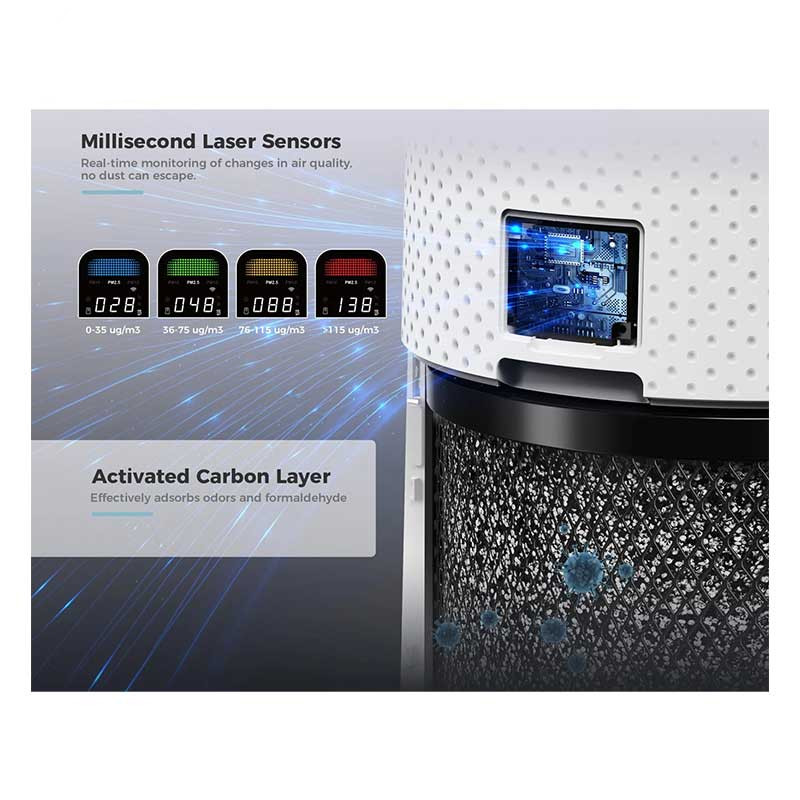 فیلتراسیون 5 مرحله ای: فیلتر مش قابل شستشو – فیلتر اولیه – فیلتر هپا 13 – فیلتر کربن فعال – فیلتر استریلیزاسیون ماورابنفش UVC