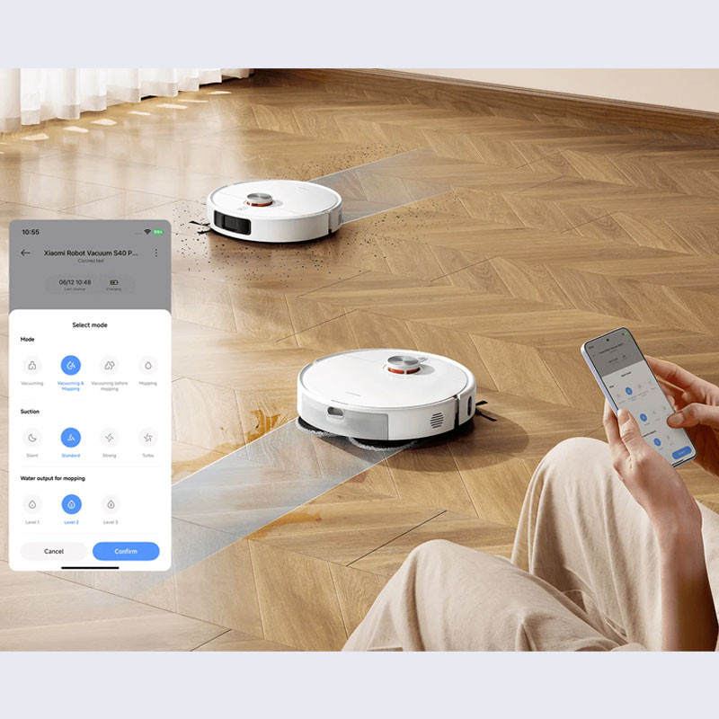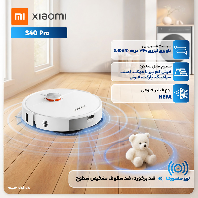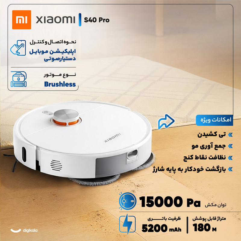 جارو رباتیک شیائومی مدل S40 Pro بهعنوان یک دستگاه نظافت هوشمند طراحی شده است تا تمیزکاری روزانه خانه را با دقت بالا و حداقل دخالت کاربر انجام دهد. ساختار جارو رباتیک شیائومی مدل S40 Pro با ابعاد 355x355x97 میلیمتر و وزن 4200 گرم تولید شده و این طراحی امکان حرکت پایدار و عبور از فضاهای باریک را فراهم میکند. موتور براشلس با توان مکش 15000 پاسکال در جارو رباتیک شیائومی مدل S40 Pro قدرت کافی برای جمعآوری گردوغبار، ذرات ریز و زبالههای درشت را تأمین میکند. فیلتر HEPA نیز با جذب ذرات معلق، آلودگی هوا را کاهش میدهد.