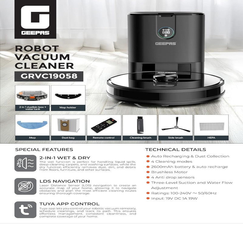 اگر به دنبال یک راهکار هوشمند برای تمیز نگهداشتن منزل یا محل کار خود هستید، جاروبرقی رباتیک GEEPAS مدل GRVC19058 یکی از گزینههای ایدهآل و کارآمد در بازار است. این ربات دوکاره با قابلیت مکش و تیکش همزمان، تجربهای متفاوت از نظافت را برای شما فراهم میکند.